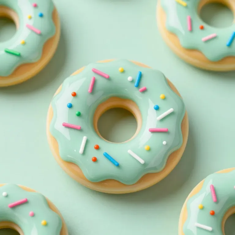 Close-up of donuts with glossy mint-green glaze and vibrant sprinkles, softly lit to create a gentle glow and subtle highlights, emphasizing the texture and color contrast against a blurred light teal background.