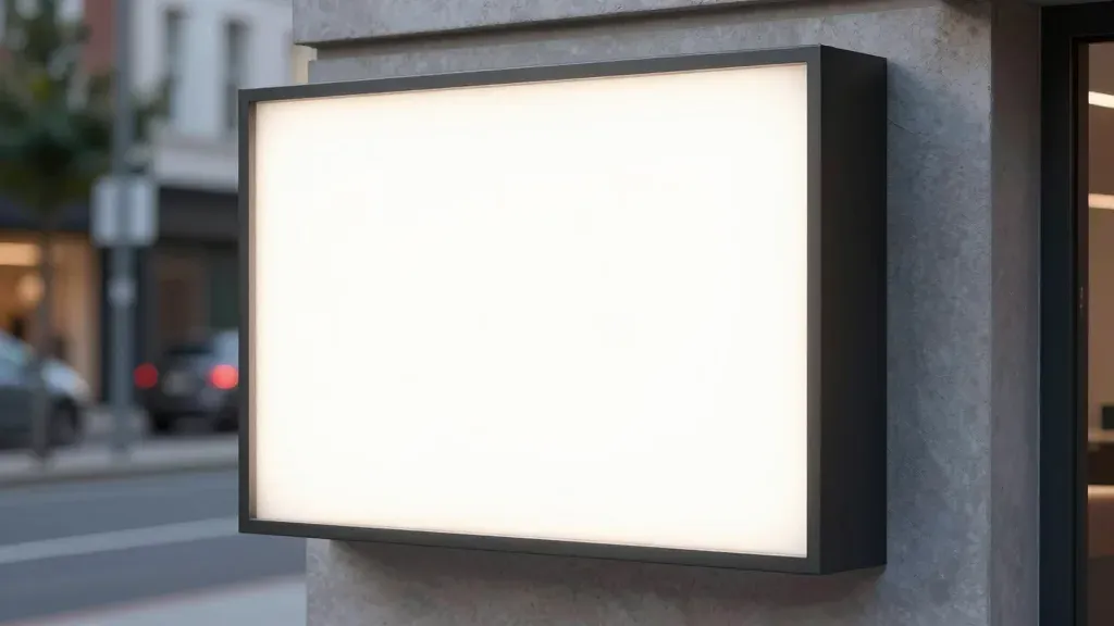 A glossy black lightbox emits a warm white glow, framed by a rough stone pillar, with a blurred urban street and vehicles in the background. The shallow depth of field highlights the lightbox, creating a clean and focused composition.