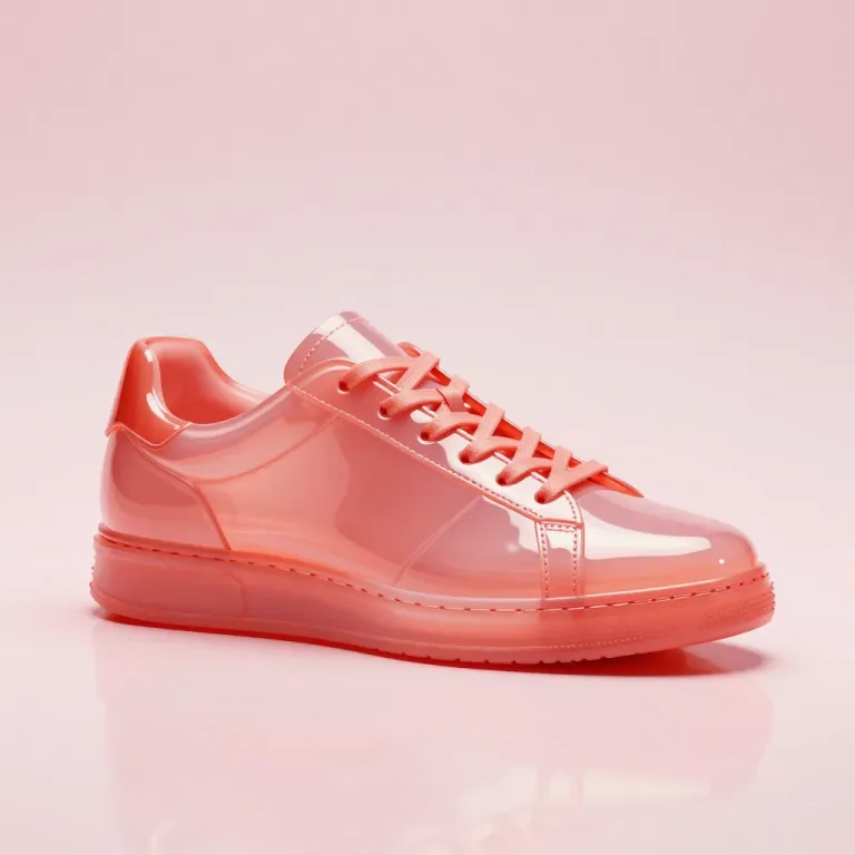 A side view of a translucent acrylic sneaker with coral and white tones, showcasing its glossy texture and soft diffused lighting. The clean, uncluttered white background emphasizes the shoe's design and vibrant colors.