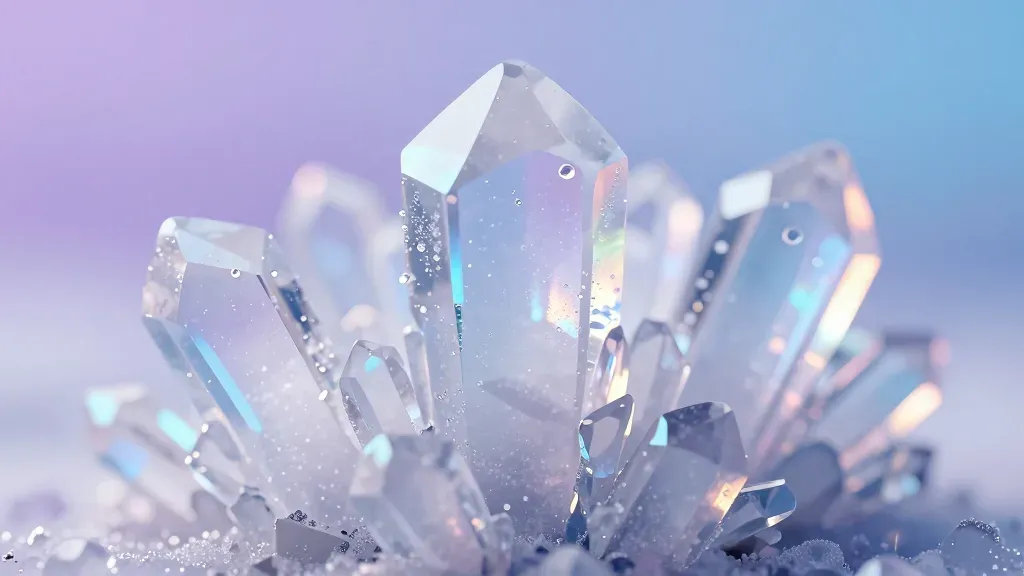 A cluster of iridescent ice crystals glisten under soft, diffused light, highlighting their frosty texture and vibrant blue and purple hues. The blurred gradient background emphasizes the foreground crystals, creating a serene and ethereal atmosphere.