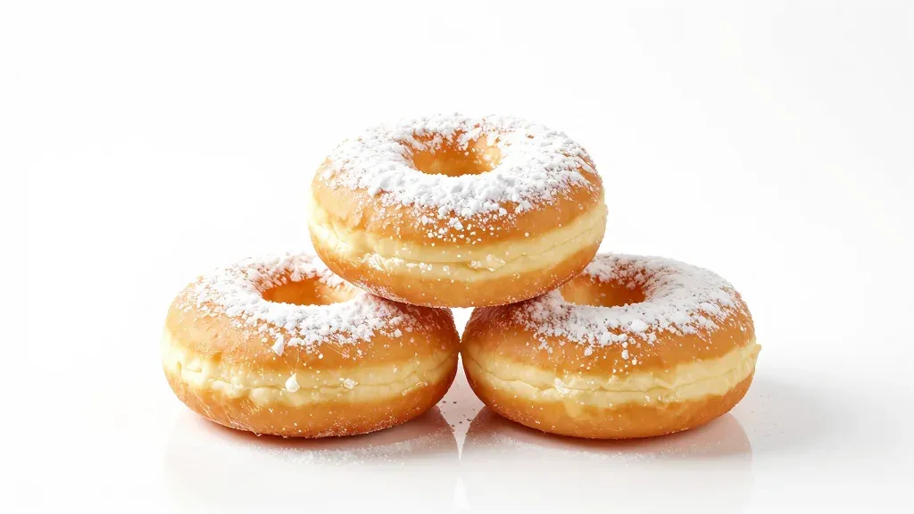A pyramid stack of powdered sugar donuts, showcasing their soft, glossy texture and warm golden hues under soft, diffused lighting. The clean white background and minimalistic composition emphasize the donuts' inviting appearance and create ample copy space.