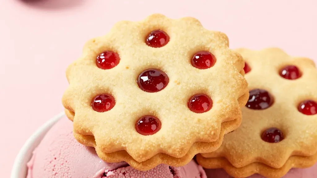 A close-up of a golden biscuit sandwiched with glossy red jam, highlighted by soft, diffused lighting that accentuates the biscuit's texture and the jam's sheen. The shallow depth of field and soft pink background provide a clean and simple backdrop, ideal for food photography and product shots.