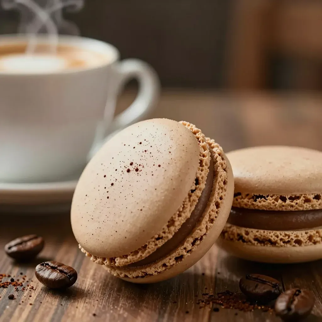 #Macarons#Coffee#Cocoa#Delicate#Crisp#Warm Lighting#Shallow Depth of Field#Cozy Atmosphere#Food Photography