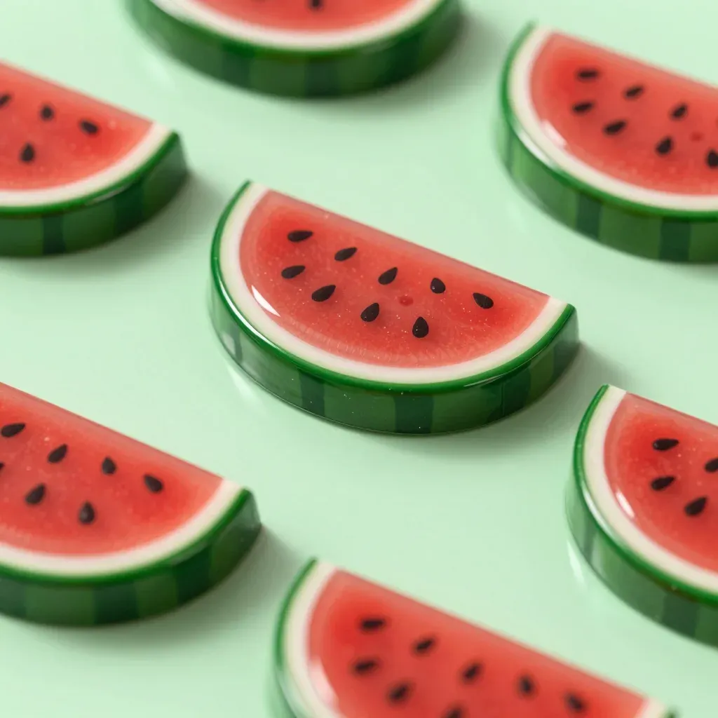 A close-up of glossy, translucent watermelon slices with a slight sheen, arranged on a uniform mint green background. The diffused, soft lighting from above creates highlights and subtle shadows, emphasizing the vibrant red flesh, green rind, and black seeds. The shallow depth of field focuses on the central slice, with the background slightly blurred to emphasize the watermelon slices.