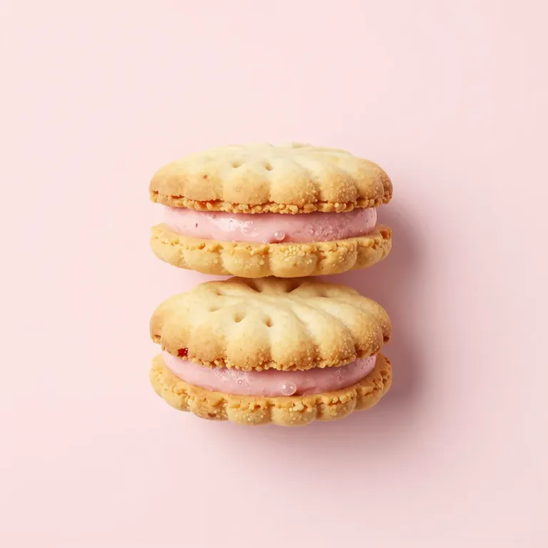 Golden-brown checker cookies sandwiched with creamy pink filling, softly lit to highlight texture and sheen, set against a clean, soft pink background that enhances the aesthetic appeal.