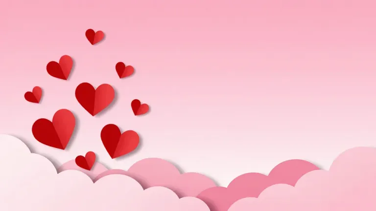 Glossy red paper hearts gently float among soft white clouds against a dreamy, blurred pink gradient background. The diffused, soft lighting creates a serene and romantic atmosphere, ideal for valentine-themed designs.