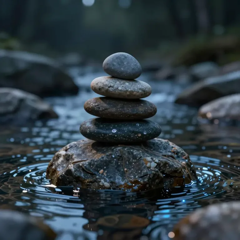 A stack of smooth, rounded stones is balanced on a textured rock, surrounded by a misty forest and a reflective water surface. The soft, diffused light highlights the stones and creates a serene, meditative atmosphere.