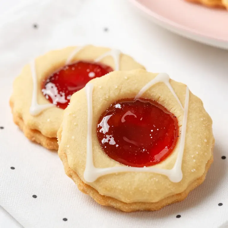 Two golden-brown thumbprint cookies feature glossy crimson cherry jam centers and delicate white icing drizzles, dusted with fine sugar. Soft high-key lighting from the upper left highlights the textures, while shallow depth of field and a clean polka-dotted background provide visual focus and copy space.