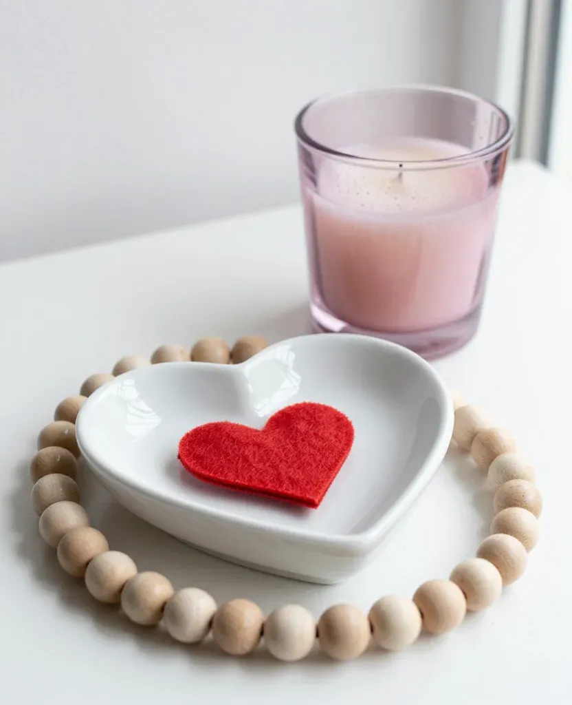A white ceramic heart-shaped dish holds a crimson red felt heart, encircled by smooth wooden beads, with a blush pink candle softly blurred in the background. Soft diffused natural light from the upper left creates gentle highlights on the glossy ceramic rim and glass candle holder, while the shallow depth of field and minimalist white surface provide clean copy space.