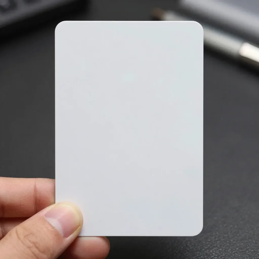 A hand delicately grips a smooth, glossy white credit card against a dark, textured background. The soft, diffused lighting highlights the card's edges and the hand's grip, creating a clean and focused composition.