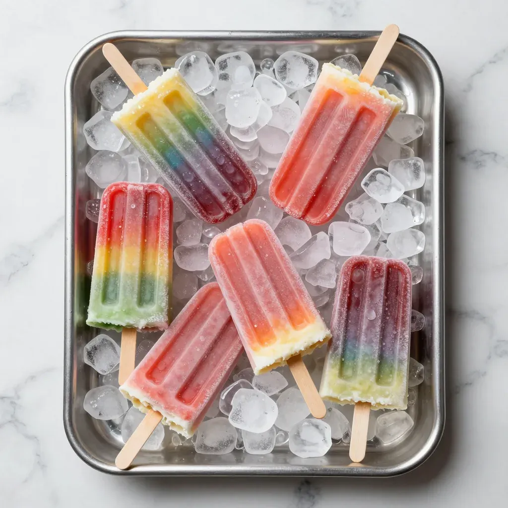Smooth, creamy rainbow popsicles with glossy ice cubes, softly lit to highlight vibrant colors and reflective ice. Clean marble backdrop slightly blurred, emphasizing popsicles as focal point.