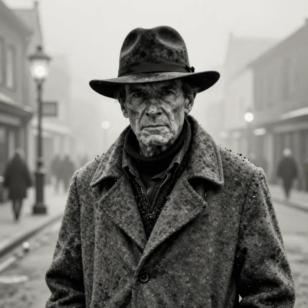 A weathered detective stands in the fog, his rough coat and worn fedora catching the diffused light from the streetlamp. The soft shadows and muted tones create a moody, atmospheric setting with a shallow depth of field that draws focus to the subject.