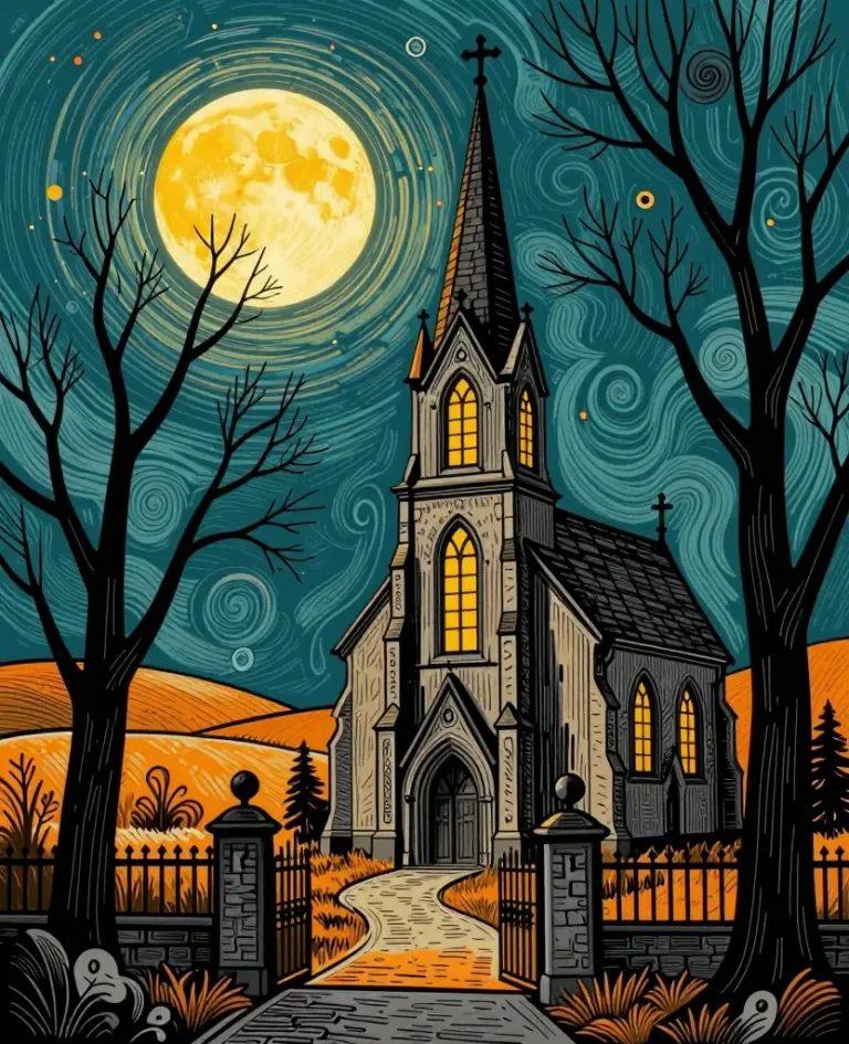 A serene night scene featuring a Gothic chapel with glowing stained-glass windows, illuminated by the soft light of a full moon. The symmetrical composition and swirling night sky create a captivating and atmospheric setting.
