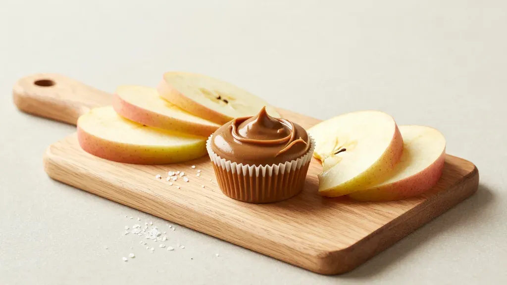 A cupcake with creamy peanut butter sauce is surrounded by neatly sliced apples on a rustic wooden cutting board, highlighted by soft, diffused lighting that accentuates the textures and creates gentle shadows. The neutral background ensures the subject remains the focal point, with ample copy space for design integration.