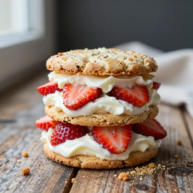 A golden strawberry shortcake stack with creamy white frosting and glossy red strawberries, softly lit by a nearby window, creating a cozy, homey setting with a rustic wooden surface and blurred white cloth in the background.