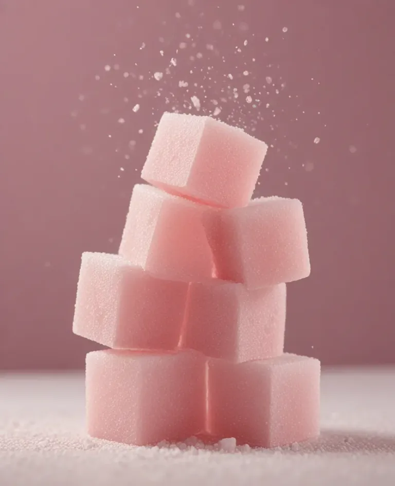 A tower of frosted candy cubes, each cube smooth with sugar crystals on top, softly illuminated by diffused light that highlights the texture and sugar crystals, creating a sense of depth against a blurred pink background. The composition is centered with a slight upward tilt, providing ample copy space for design elements.