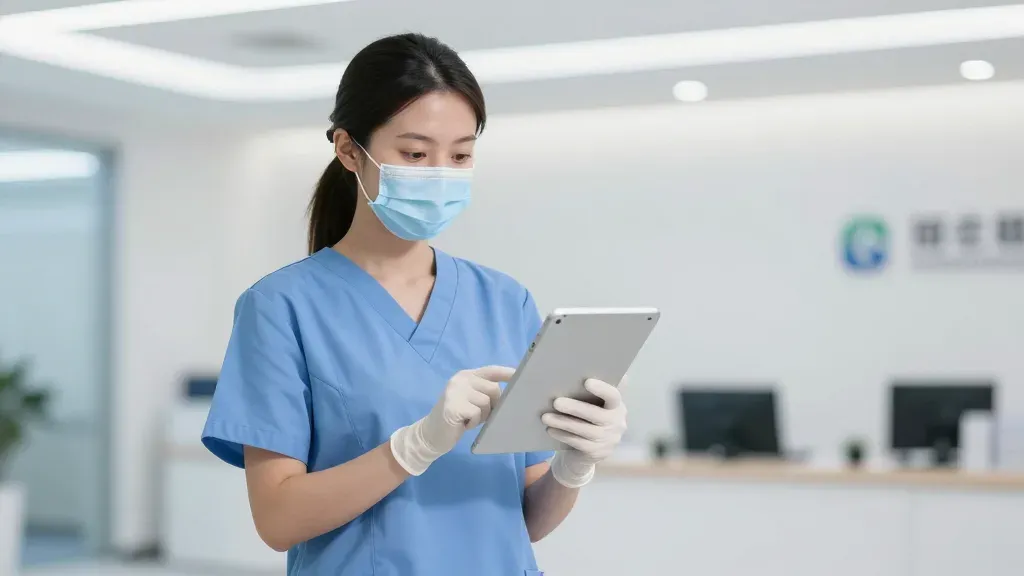 A nurse in blue scrubs and a surgical mask interacts with a glossy tablet, set against a soft, ambient light in a clean, modern clinic. The close-up shot emphasizes the nurse's focused interaction, creating a calm and professional atmosphere.