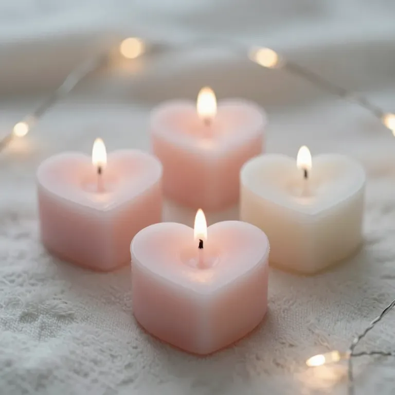 A cluster of heart-shaped candles with soft, flickering flames, set against a delicate lace background and diffused string lights, creating a warm and intimate atmosphere. The composition focuses on the central heart-shaped candle, with a shallow depth of field and a dreamy, soft focus background.