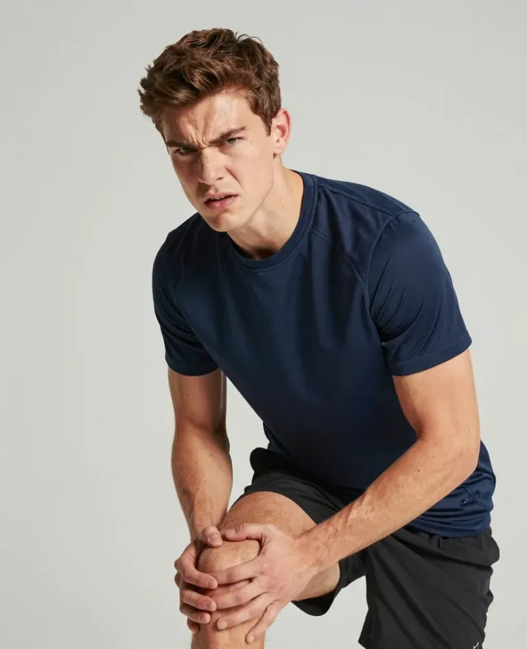 A focused athlete in a dark blue athletic shirt holds his knee, showcasing a moment of discomfort. The soft, diffused lighting highlights the texture of his skin and the material of his clothing, creating a detailed and intimate portrait.