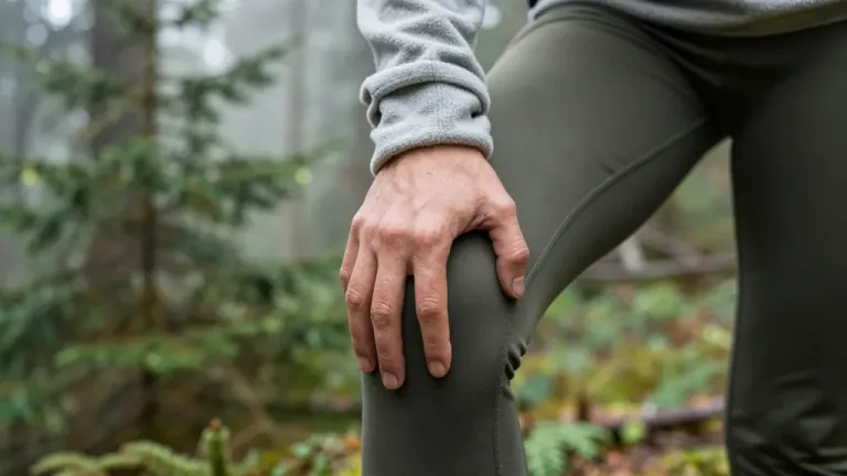 A close-up of a hand with rough, calloused skin resting on olive-green leggings, set against a softly lit, blurred forest background. The diffused light highlights the textures of the hand and leggings, creating a serene and natural atmosphere.