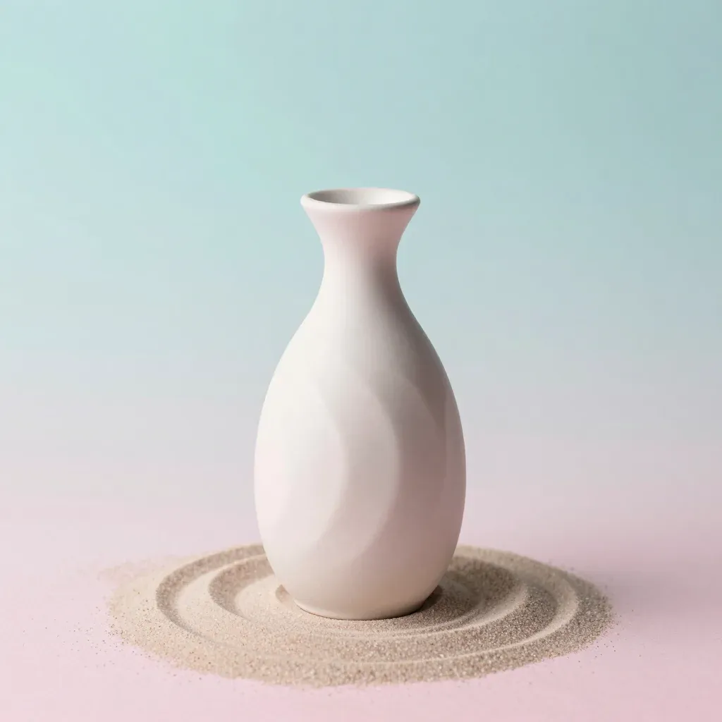 A smooth, matte white ceramic vase sits centered on a sand garden, bathed in soft, diffused light that creates gentle shadows. The blurred pastel background emphasizes the vase and sand garden, providing a serene and minimalist aesthetic.