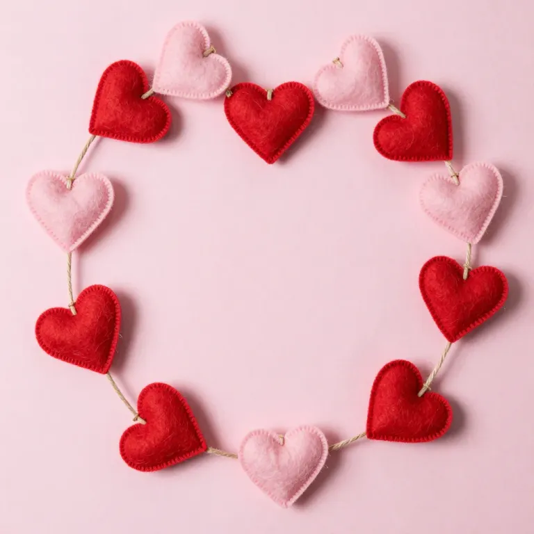 A soft, plush felt heart garland curves symmetrically on a solid pink background, creating a gentle, diffused glow. The balanced composition and soft lighting make it ideal for Valentine's Day or romantic decor.
