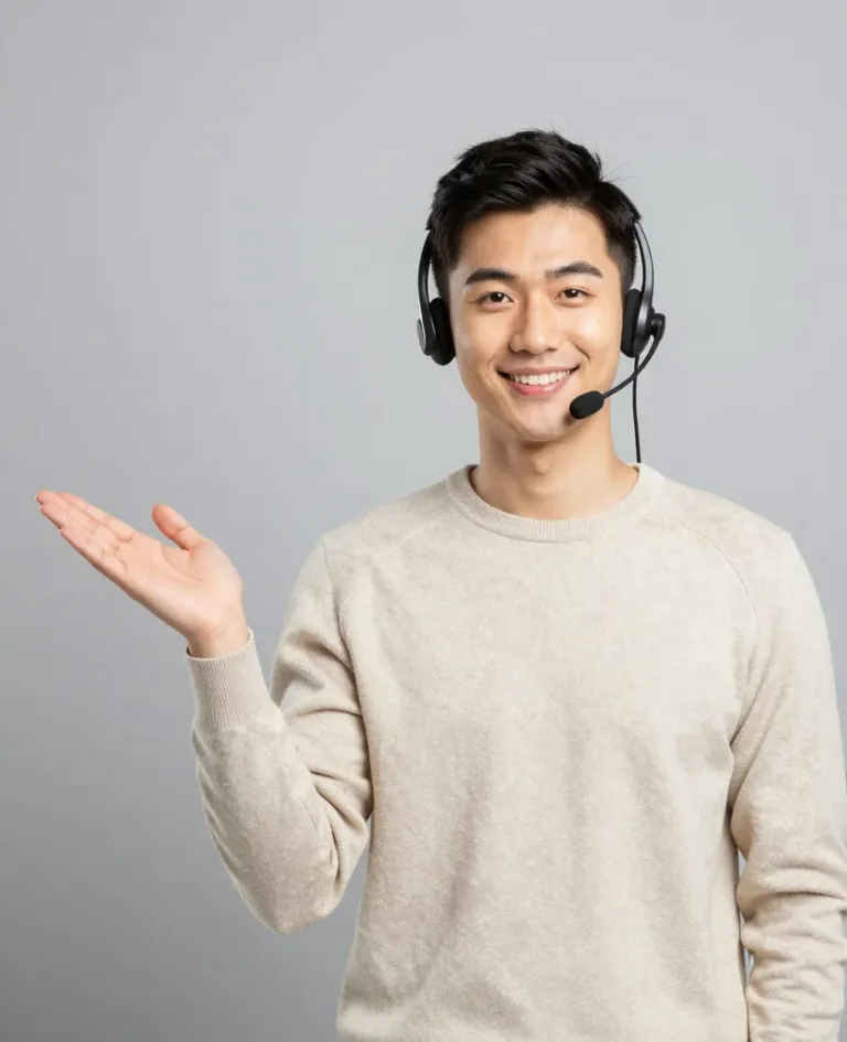 A young man in a beige sweater gestures with his hand while wearing a black headset, set against a neutral gray background. The even lighting highlights the subject without harsh shadows, creating a clean and professional look.
