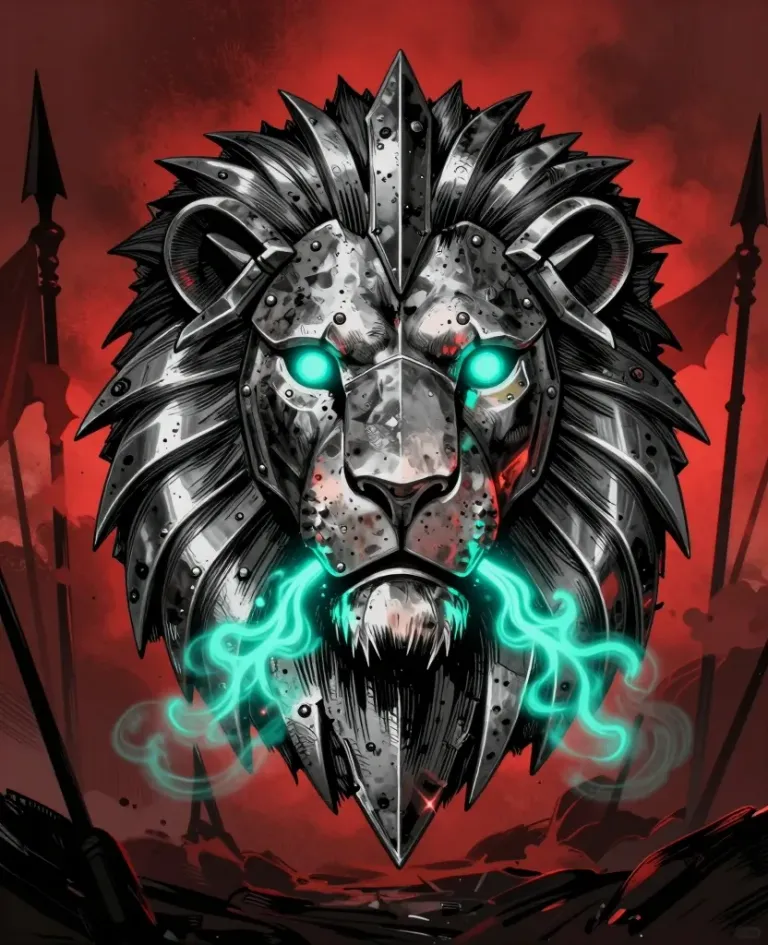 A mechanical lion's head forged from riveted steel plates radiates cyan energy from its eyes and mouth, set against a fiery crimson sky. The symmetrical frontal composition with shallow depth of field and dramatic chiaroscuro lighting emphasizes the subject's imposing presence and intricate metallic textures.