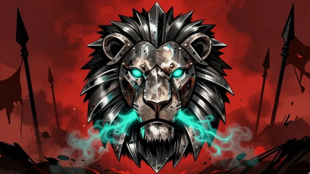A fierce armored lion's head with glowing cyan eyes and fangs dominates the frame, its metallic plates weathered from battle, while ethereal energy emanates from its maw. The low-angle perspective and shallow depth of field emphasize the lion's imposing scale against a blurred backdrop of jagged spears and smoky red skies.