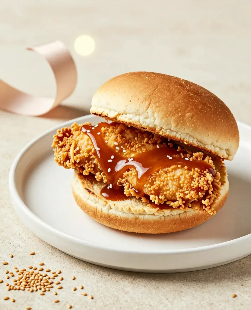 A golden-brown crispy chicken sandwich with glossy caramel sauce is served on a smooth brioche bun, resting on a white plate with scattered sesame seeds. Soft diffused lighting highlights the sauce's viscosity and the bun's texture, while a shallow depth of field and clean beige background emphasize the subject with minimal distraction.