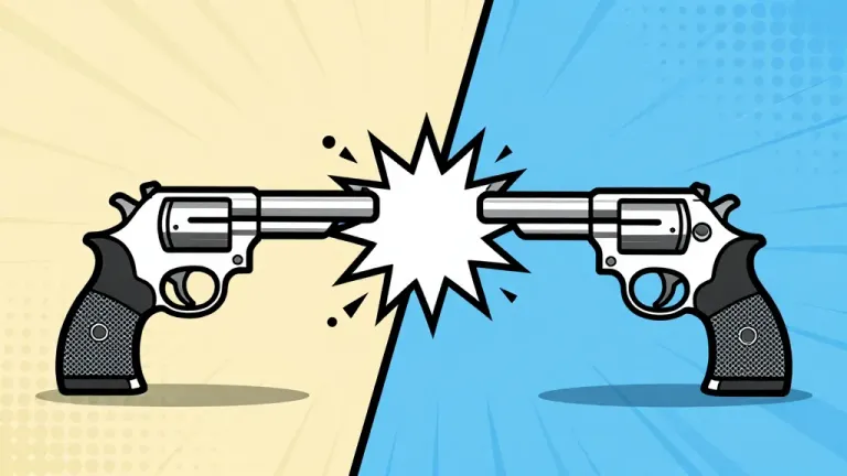 Two revolvers engage in a dramatic faceoff with a bright, sharp, high-contrast lighting that highlights the glossy metal and sharp lines. The split background with contrasting colors adds depth and energy to the composition.