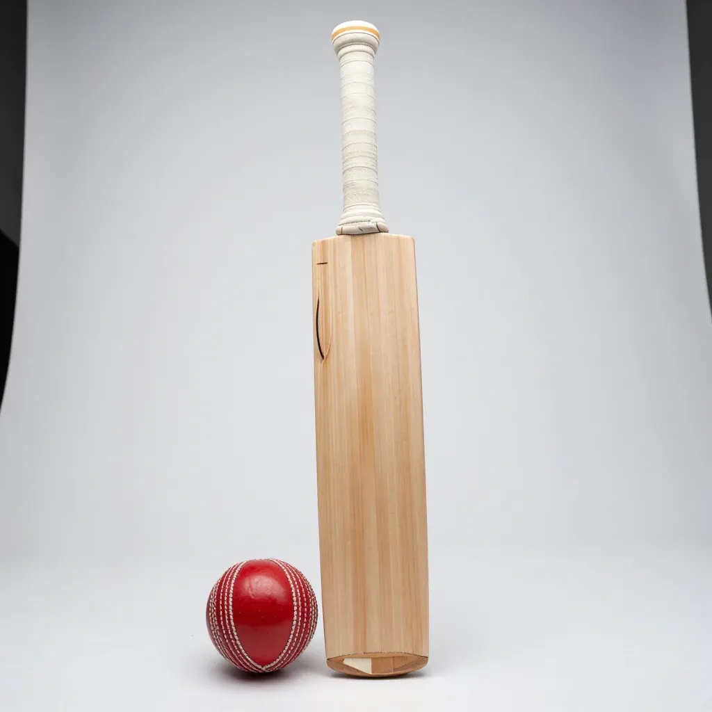 A cricket bat and textured red ball are positioned on a clean white background, highlighting the light wood grain and smooth white tape. The soft, diffused lighting enhances the textures and creates gentle shadows, emphasizing the readiness for play.