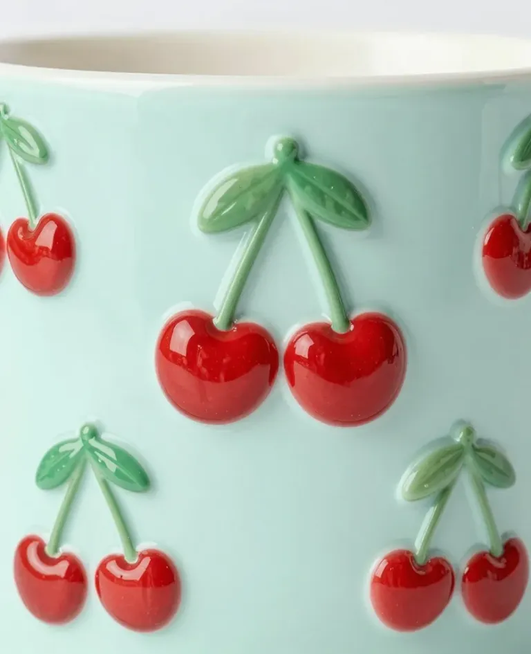 A close-up of a glossy ceramic mug adorned with plump, red cherries, highlighted by soft, diffused lighting that accentuates the glossy texture. The blurred background emphasizes the mug and cherries, creating a clean and focused composition.