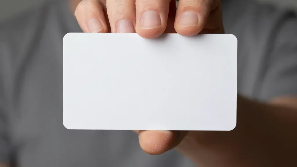 A hand holds a smooth, glossy, reflective white card against a soft, diffused light that creates gentle shadows, emphasizing the card's clean and pristine surface. The shallow depth of field isolates the card, drawing attention to its simplicity and potential for customization.