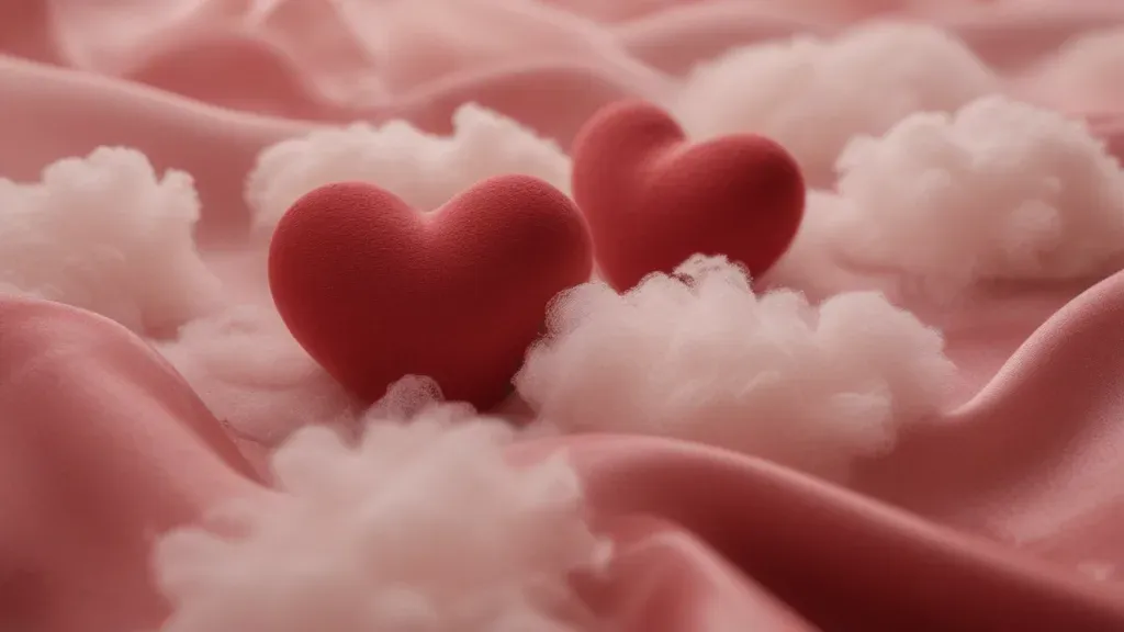 Two glossy red velvet hearts rest amidst fluffy white clouds, creating a dreamy and romantic atmosphere. The soft, diffused lighting enhances the texture and depth of the scene, making it ideal for valentine's day or love-themed designs.