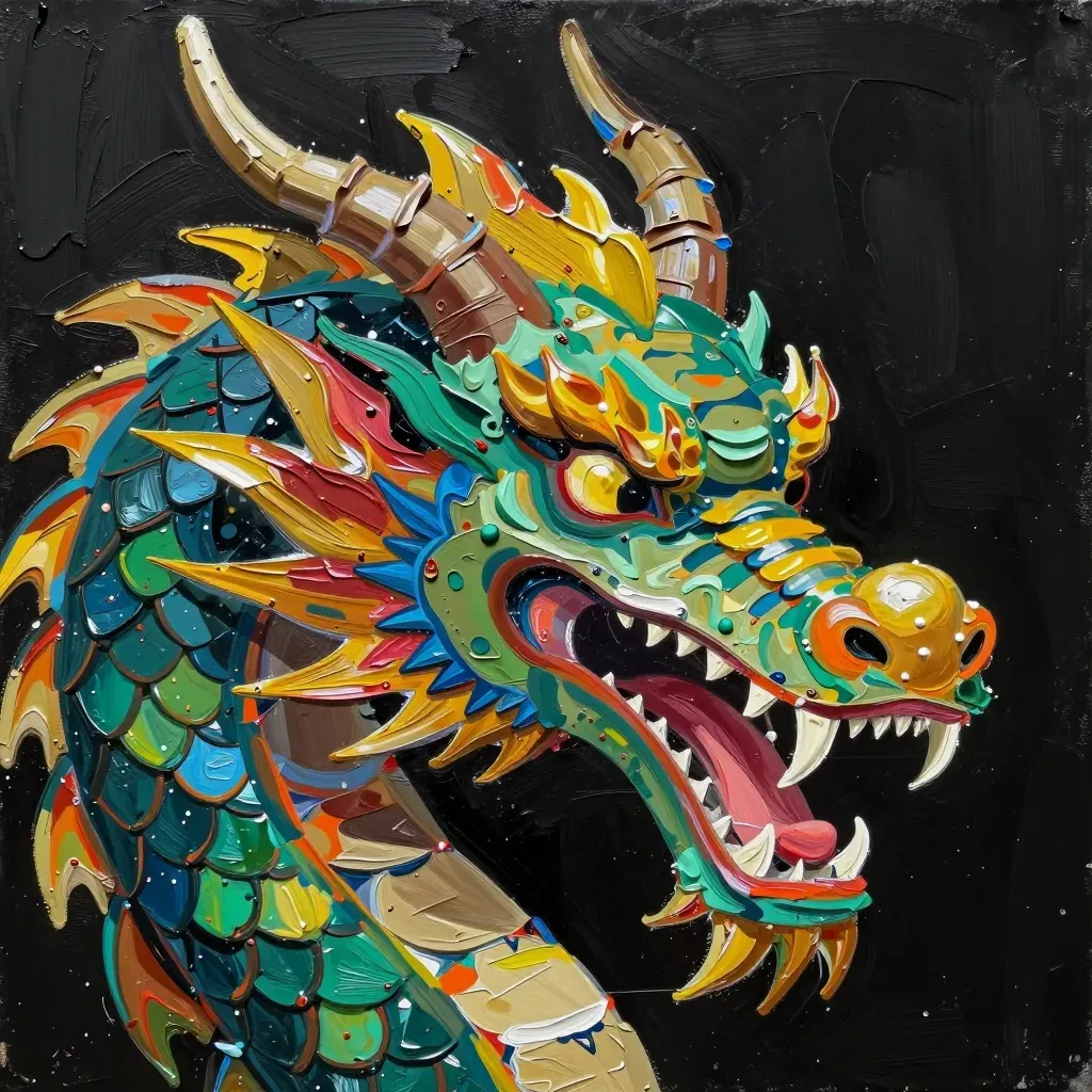 A fierce dragon's head, its scales glossy and rough, highlighted by warm directional light, creating deep shadows and highlights. The dark, starry background emphasizes the vibrant colors and intricate details of the dragon's head.