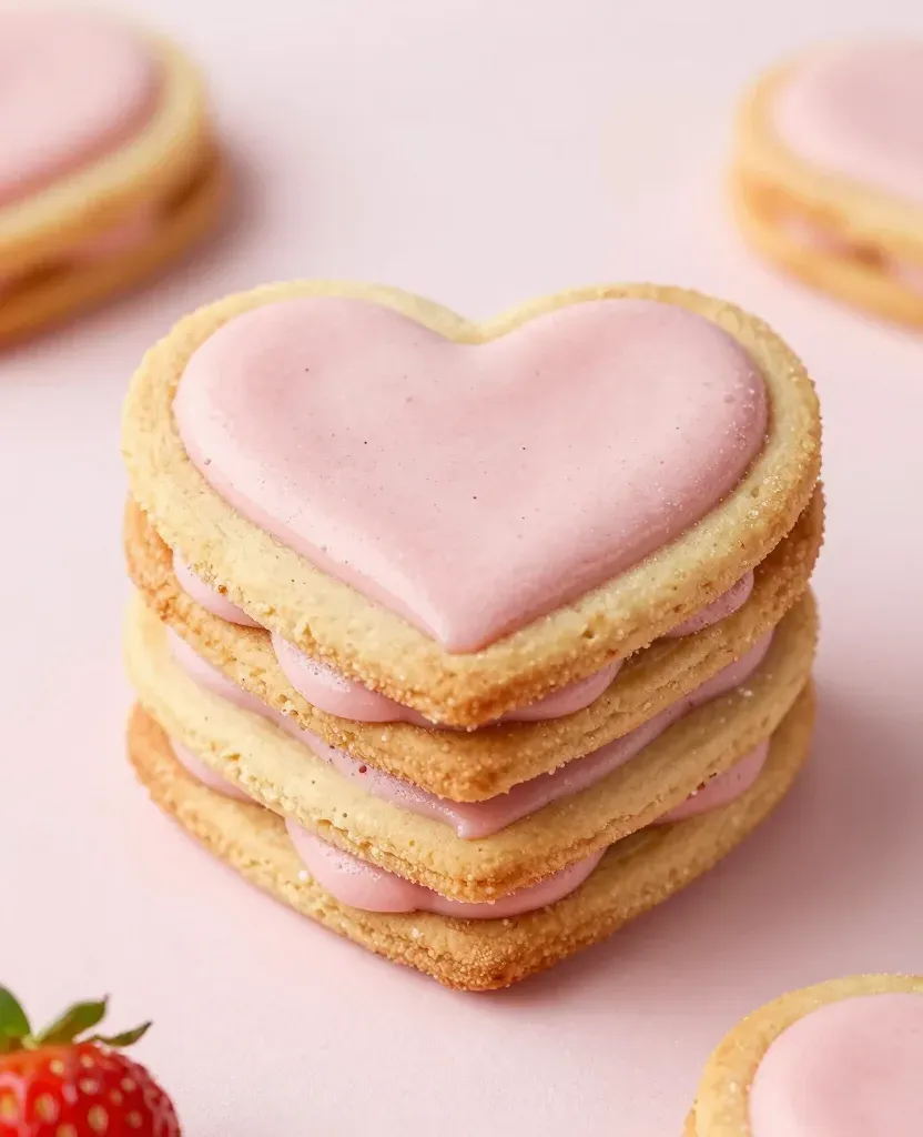 A stack of heart-shaped cookies with smooth pink frosting and creamy filling, illuminated by soft, ambient light that creates gentle shadows and highlights, set against a clean, blurred pink background that keeps the focus on the cookies.