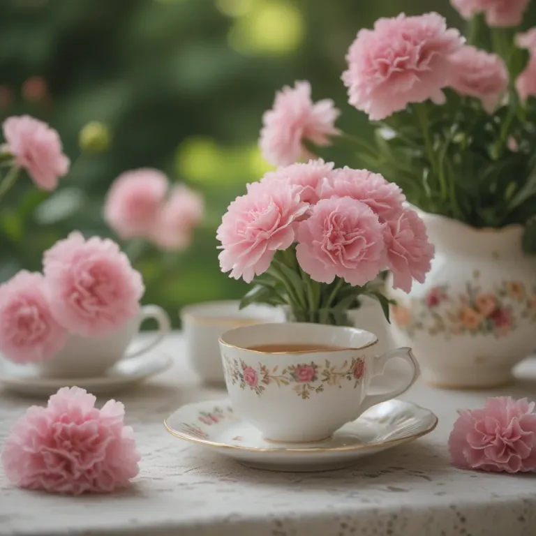 A teacup adorned with a floral pattern sits on a lace tablecloth, surrounded by soft pink carnations. The diffused light highlights the delicate textures and creates a serene, intimate setting.
