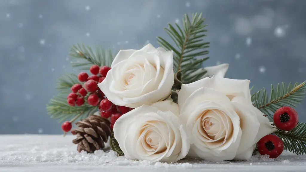 A bouquet of white roses, pine branches, and red berries is arranged on a snowy surface, with soft, diffused light highlighting the glossy berries and powdery snow. The background is a blurred, snowy scene with falling snowflakes, creating a serene winter wonderland effect.