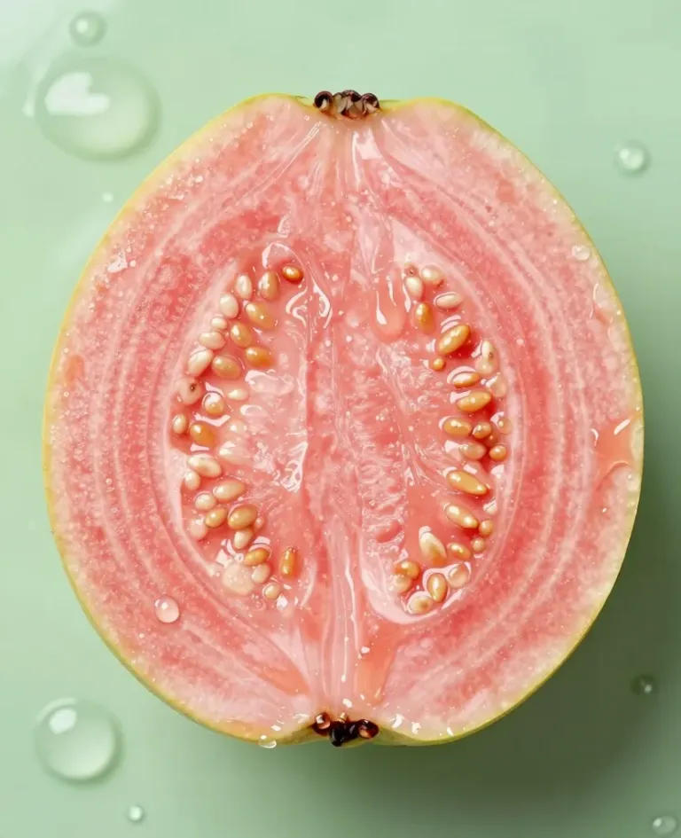 A top-down view of a guava cross-section, showcasing its soft, juicy texture and glossy sheen, with visible seeds and a vibrant pink color. The direct, high-contrast lighting highlights the natural beauty and symmetry of the fruit, set against a blurred green background.