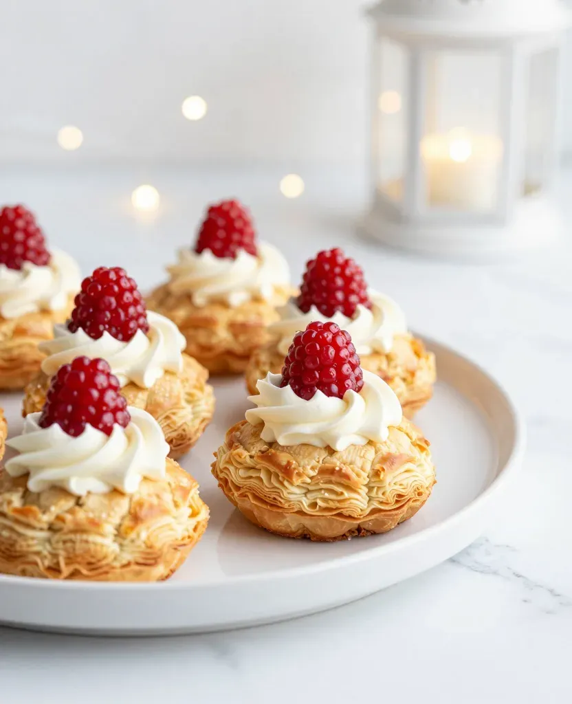 Golden choux pastries are elegantly garnished with creamy filling and glossy raspberries, set against a soft, warm, ambient light that highlights their textures and colors. The shallow depth of field and centered composition on the plate create a clean and inviting presentation, ideal for culinary and food photography.