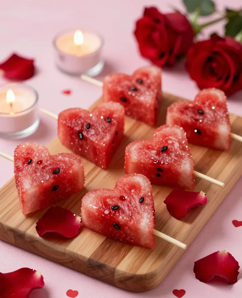 Juicy watermelon heart skewers glisten under warm, diffused light, creating a visually appealing and romantic display on a wooden cutting board surrounded by red rose petals and candles. The shallow depth of field focuses on the skewers, enhancing their glossy texture and vibrant red color against the soft pink background.