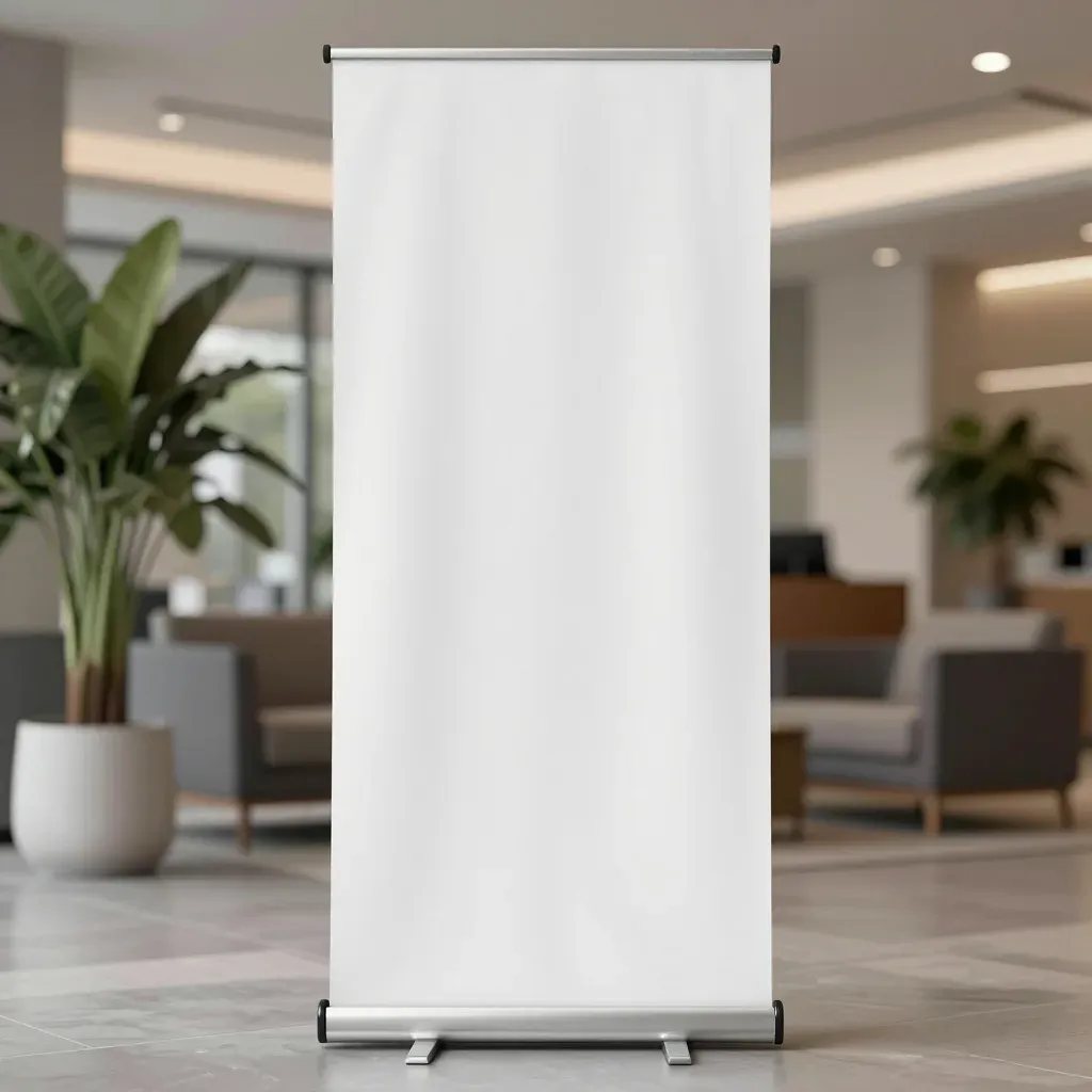 A smooth, glossy white roll-up banner stands prominently in a modern interior space, bathed in soft, natural light from large windows. The composition offers ample copy space for text or graphics, with a clean background of seating and potted plants.