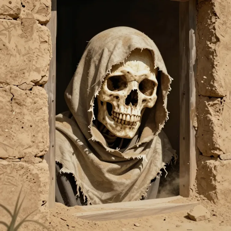A skeletal figure draped in a tattered hood stands in a gap of a weathered wall, illuminated by directional light that casts strong shadows and highlights, emphasizing the texture of the skull and the wall. The background is slightly blurred, drawing focus to the subject and creating a sense of depth.