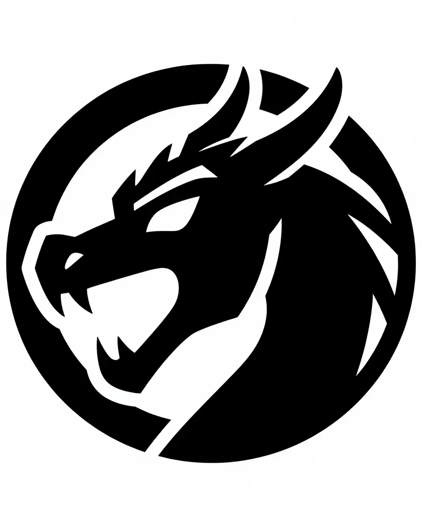 A glossy black silhouette of a dragon's head, sharply detailed and highlighted against a white background. The high-contrast lighting and circular frame emphasize the emblem's intricate design and balanced composition.