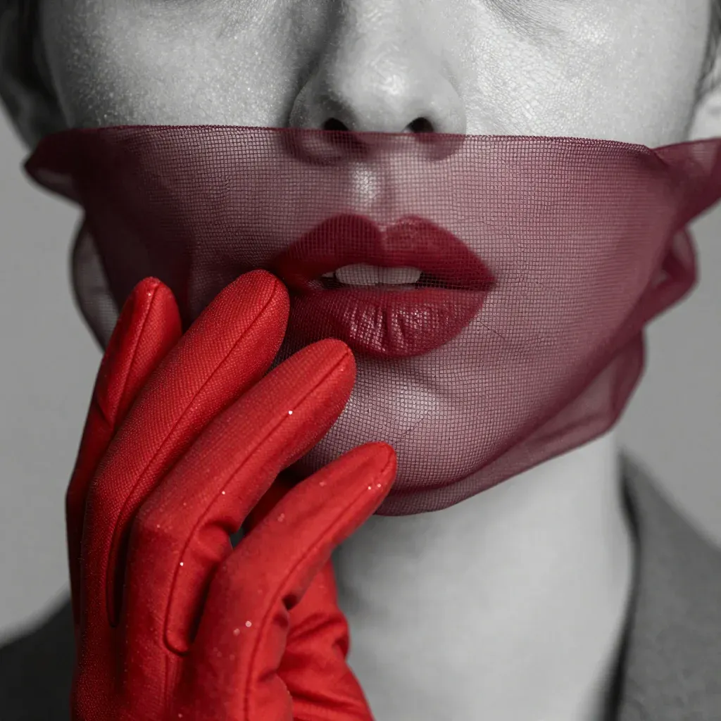 A close-up of a face partially covered by a translucent burgundy veil, with glossy red lips and a hand in a red glove, illuminated by soft, diffused lighting that highlights the textures and creates a gentle glow. The neutral, blurred background emphasizes the subject and provides ample copy space.