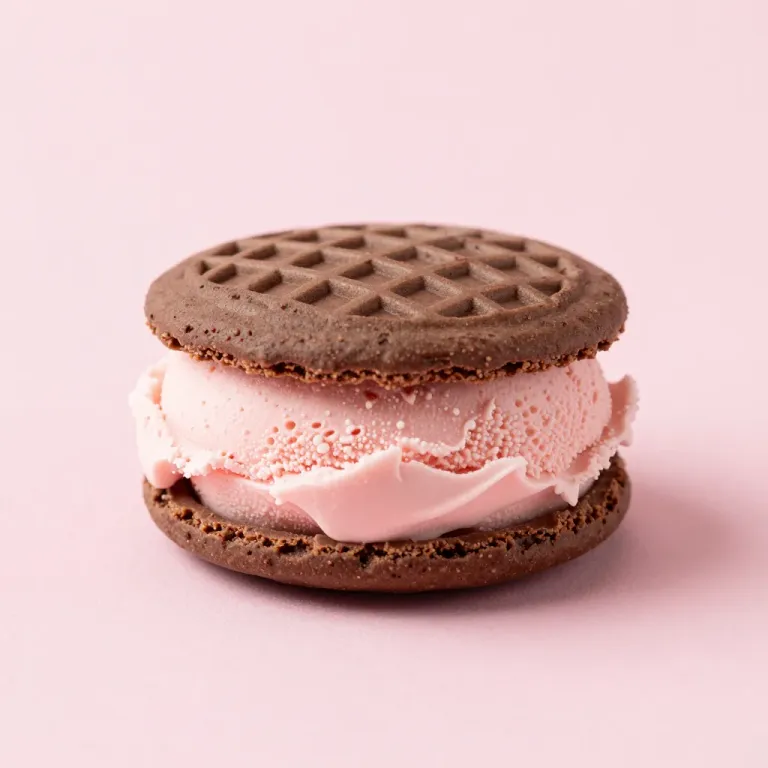 A close-up of a chocolate wafer treat with a creamy pink filling, softly lit to highlight its textures and colors, set against a blurred, light pink background providing a clean, minimalistic backdrop.