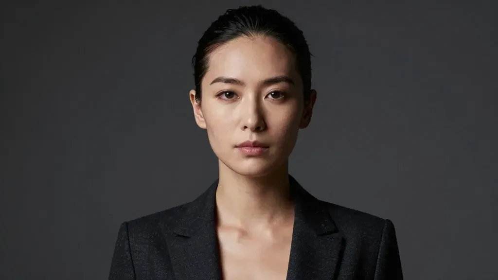 A serious businesswoman in a dark blazer with a subtle pattern, her smooth skin and direct gaze convey authority and focus. The soft, even lighting and dark, neutral background create a professional and sophisticated atmosphere, ideal for business or corporate settings.