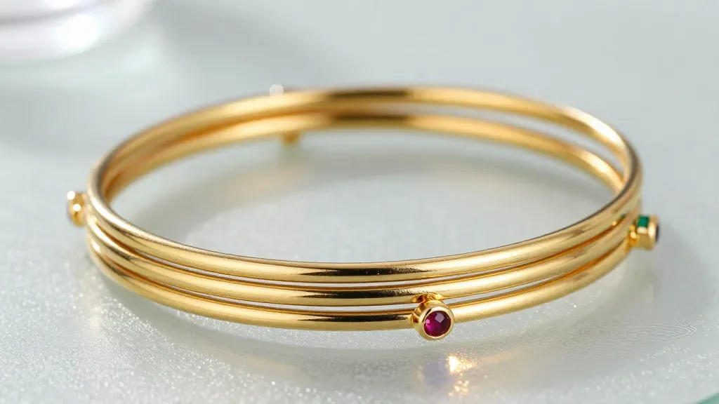 A close-up of polished gold bangles with varying designs, set against a clean white background, highlighting their smooth texture and reflective surfaces under soft, diffused lighting. The shallow depth of field blurs the background, emphasizing the jewelry's elegance and craftsmanship.