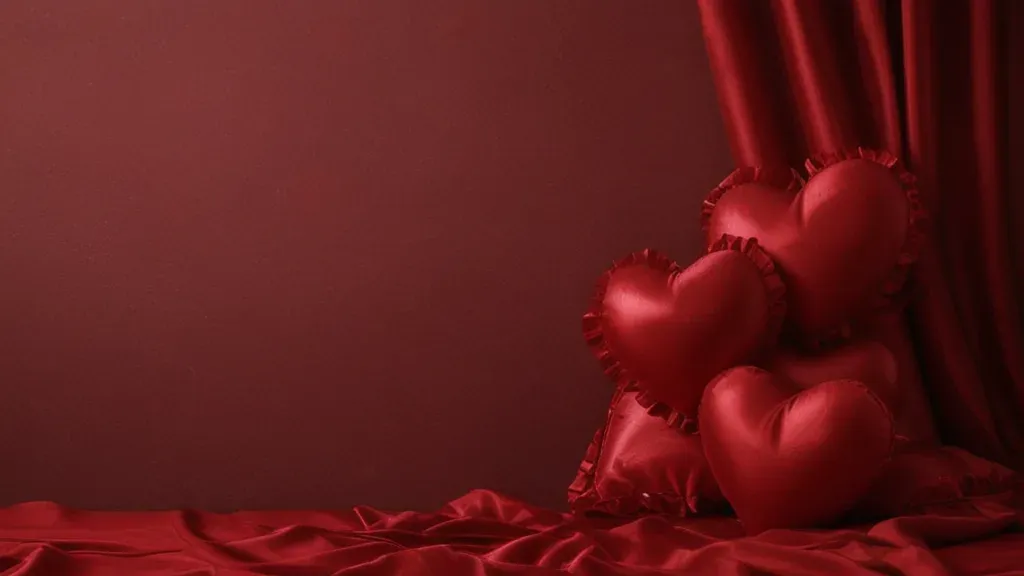Glossy, velvety heart-shaped pillows with ruffled edges cluster together in soft, diffused red light, creating a romantic and luxurious atmosphere. The blurred background of red curtain and satin sheets emphasizes the pillows, offering ample copy space for design elements.